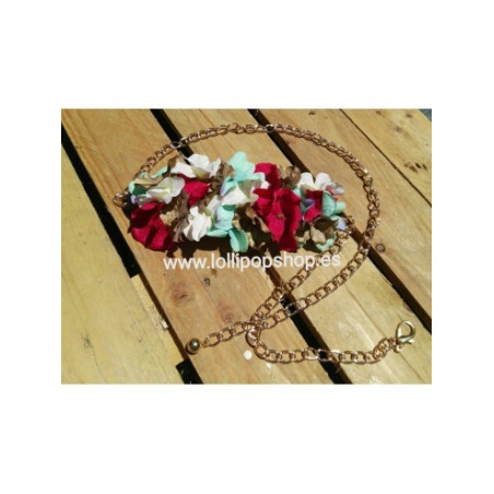 Cinturón floral Rígido con cordón dorado y tonos verde agua, blanco, dorado y rojo